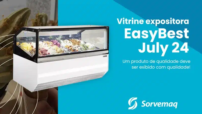 A Vitrine Expositora July da EasyBest, distribuída pela Sorvemaq, é uma solução profissional para a apresentação de gelatos artesanais. Disponível em três modelos—July 12, July 18 e July 24—ela acomoda, respectivamente, 12, 18 ou 24 cubas de 5 litros.